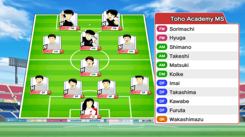 1.- Ken Wakashimazu; 2.- Kiyoshi Furuta, 6.- Katsuji Kawabe, 3.- Tsuneo Takashima, 5.- Hiroshi Imai; 4.- Hideto Koike, 7.- Yutaka Matsuki, 15.- Takeshi Sawada, 8.- Tadashi Shimano; 10.- Kojiro Hyuga, 9.- Kazuki Sorimachi.